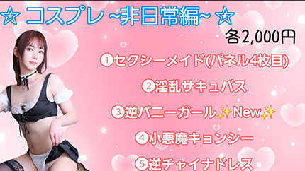 | ❤透明射精・・・3,000円 ❤聖水(出張のみ)・・・2,000円 ❤射精と聖水セット・・・4,000円(出張のみ) ![]() ❤下着の持ち帰り・・・3,000円 ![]() ☆みそのちゃん専用SMオプション☆ ❤ソフトS・・・2,000円 ❤ソフトM・・・3,000円 ![]() ![]() ❤コスプレ❤ ☆ご予約時、衣装でお出迎えします☆ 90分コース以上をご予約で日常編無料‼️ 着衣でプレイ可能です! ![]() ![]() ![]() |
